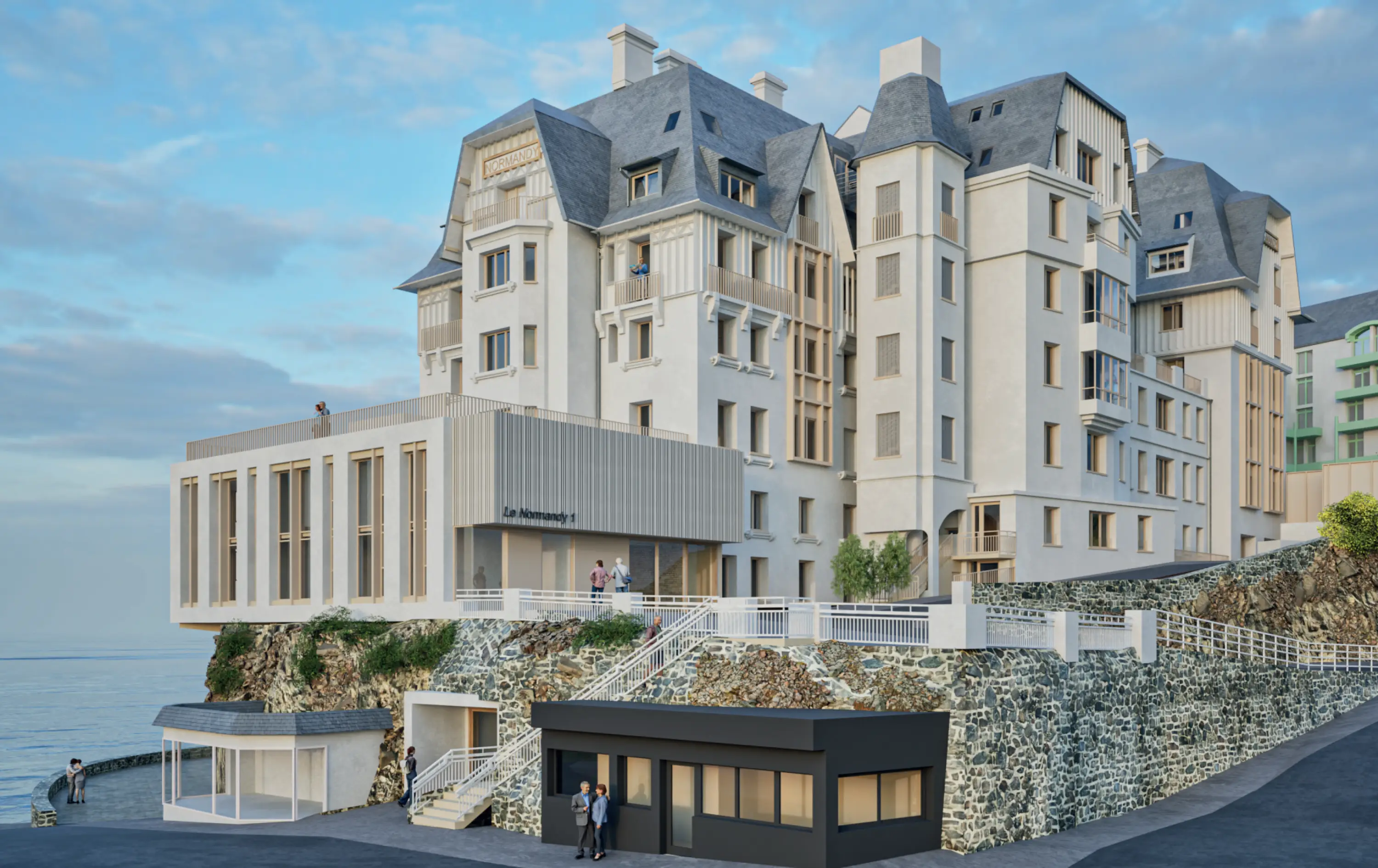 Le Normandy 1, établissement SMR de 160 lits en bord de mer à Granville. Le bâtiment fera l’objet d’une restructuration complète, intérieure et extérieure, menée en site occupé. Cette opération ambitieuse modernise les espaces avec des plateaux techniques modernes, optimise les surfaces et renforce l’attractivité et l’excellence en réadaptation, tout en garantissant la continuité des soins dans un cadre privilégié.
